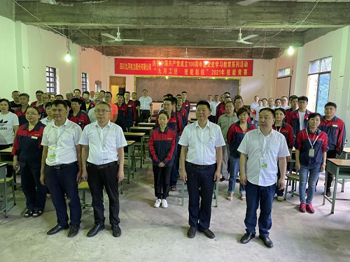 为庆祝中国共产党建党100周年暨推动党史学习教育向纵深发展,深入贯彻落实习近平总书记在全国劳动模范和先进工作者表彰大会上的重要讲话精神,7月8日,公司在欧家村电站举办了“九河工匠 技能起航”2021年技能竞赛活动。公司党委委员、纪委书记、工会主席曾朝东主持活动,公司班子成员宋德行、胡德雄、滕鹏出席并现场指导竞赛,公司欧家村电站、外协运行部、工程分公司、综合办公室、调度营销部五个部门共60余名员工踊跃参与竞赛。
