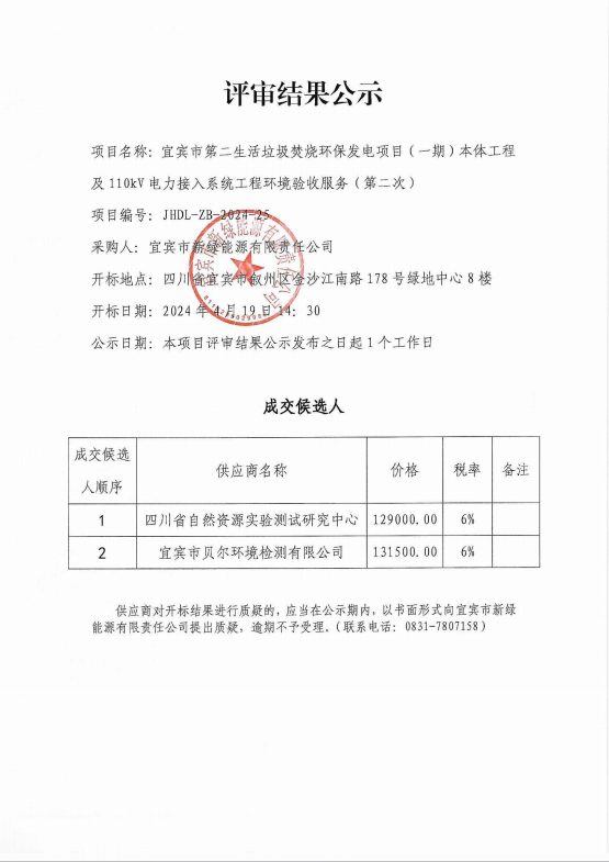 宜宾市第二生活垃圾焚烧环保发电项目(一期)本体工程及110kV电力接入系统工程环境验收服务(第二次)评审结果公示