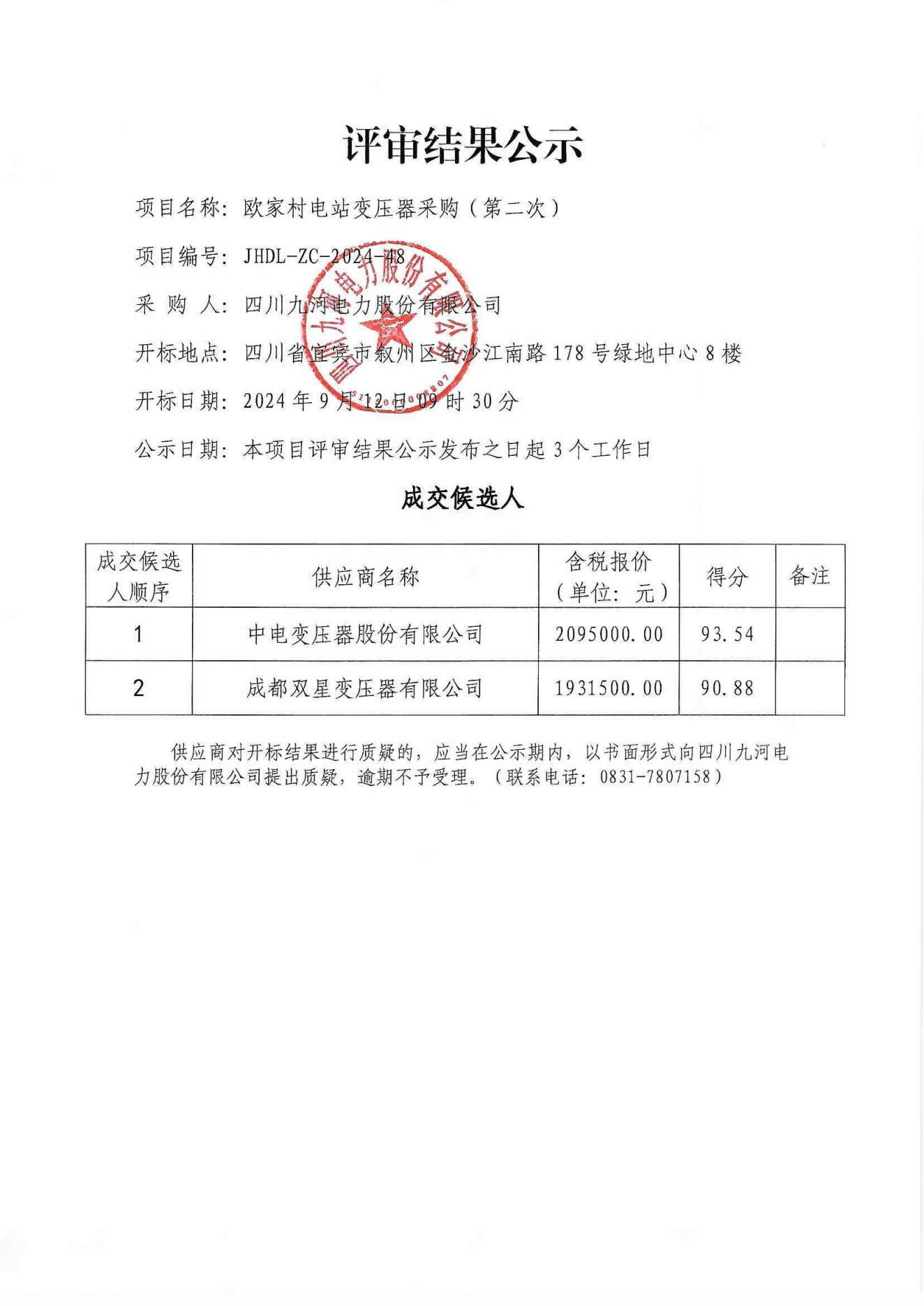 四川九河电力股份有限公司关于欧家村电站变压器采购(第二次)项目评审结果公示